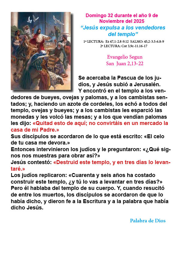 El celo por la casa de Dios: Jesús actúa con una pasión divina para proteger el templo de la mercantilización. La reflexión nos invita a tener el mismo celo por los lugares sagrados y, de manera más importante, por nuestro propio corazón, que es el "templo del Espíritu Santo".